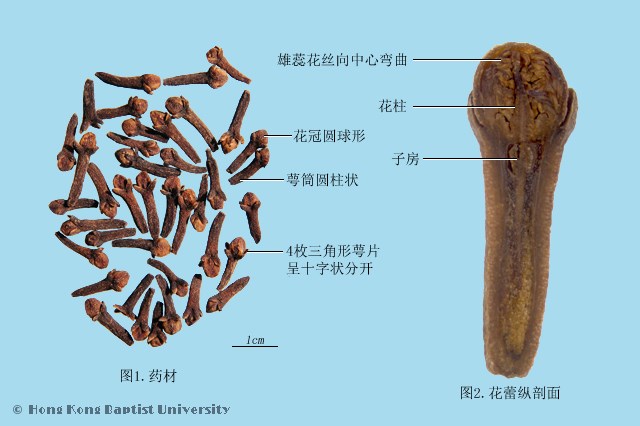 干燥的花蕾略呈短棒状,长1.5~2cm,红棕色至暗棕色;下部为圆柱状略扁的萼管,长1~1.3cm,宽约5mm,厚约3mm,基部渐狭小,表面粗糙,刻之有油渗出,萼管上端有4片三角形肥厚的萼;上部近圆球形,径约6mm,具花瓣4片,互相抱合。将花蕾剖开,可见多数雄蕊,花丝向中心弯曲,中央有一粗壮直立的花柱,质坚实而重,入水即沉;断面有油性,用指甲划之可见油质渗出;气强烈芳香,味辛。
